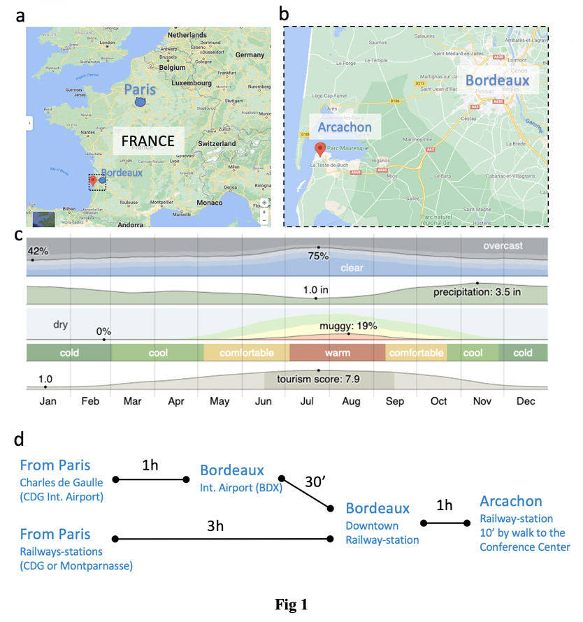The conference center is a 5-minute walk from the Arcachon train station, just across from the beach. More info and train tickets at the French Railways website.